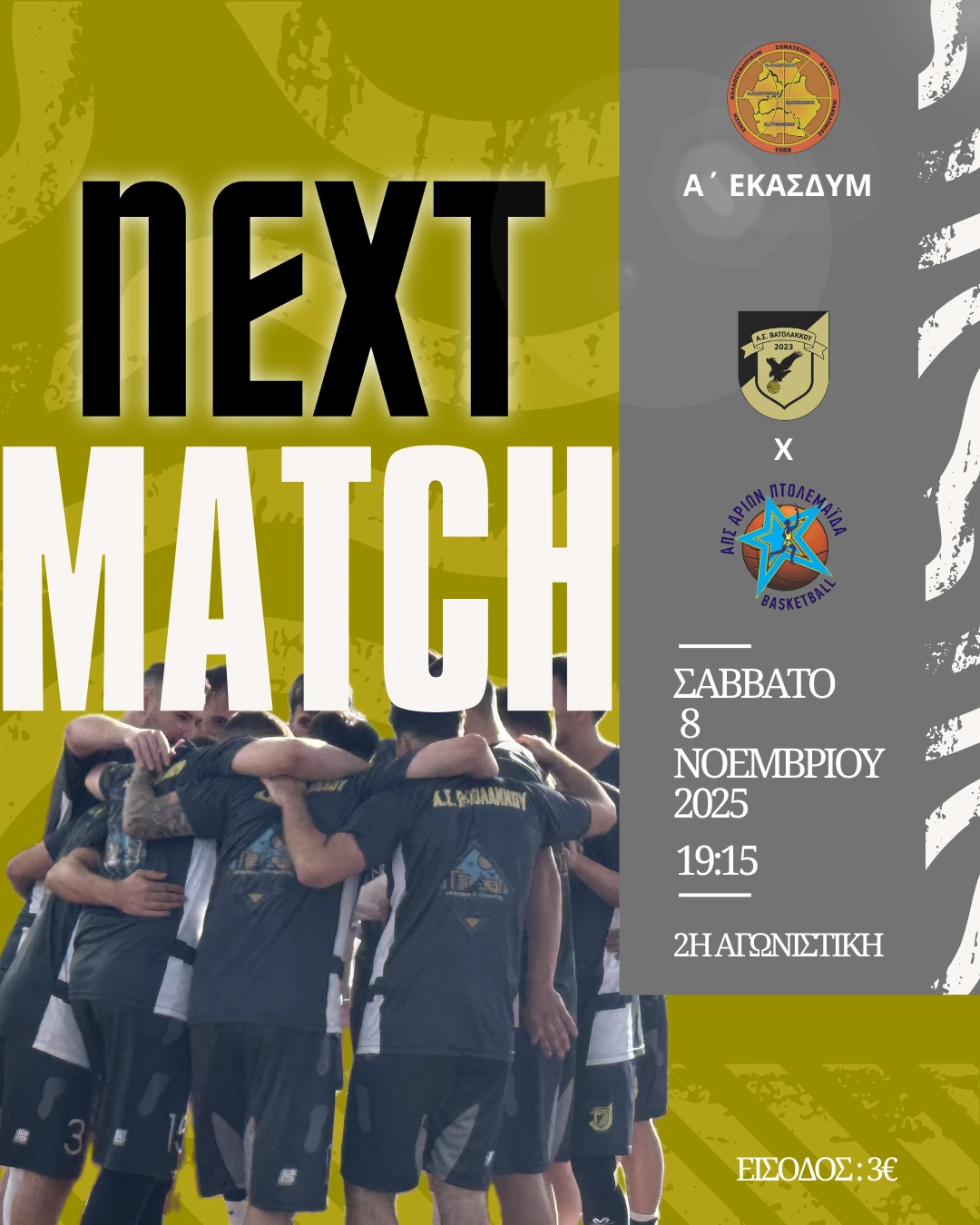 Συνεχίζεται η αγωνιστική δράση για την ομάδα μας και στα πλαίσια του πρωταθλήματος Α’ ΕΚΑΣΔΥΜ αντιμετωπίζει τον ΑΡΙΩΝ ΠΤΟΛΕΜΑΙΔΑΣ, στο ΔΑΚ ΓΡΕΒΕΝΩΝ.